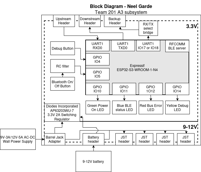 Featured on this page is a block diagram for subsystem A2. This subsystem is responsible for being the onboard bluetooth relay, as well as serving as a backup onboard control panel. - A 9V (can be raised to 12V or higher if needed) power section handles power sharing across other team boards - 9V power is shared through the daisy-chain headers (low current, max 4A total) and through 4 high-current JST headers (10A each, in practice no supply on our system can output this much) - A removable battery is connected via a JST header - A wall power source (either 9V 2A or 12V 5A) can be connected via a barrel jack. - A 3.3V regulator supplies the voltage necessary for the ESP32 to function. - Data transmission within the robot is handled through 8-pin UART bus connectors. - Programming is done via a microUSB interface connected to the ESP32 microcontroller. - In order to facilitate remote control, the ESP32's bluetooth low-energy (BLE) module is used to communicate bidirectionally with subsystem A2 to send sensor data and recieve user input data.