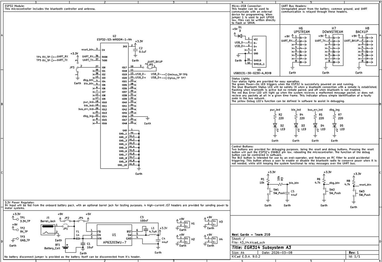 This schematic is design to function as an onboard bluetooth low energy server for connecting to a remote control unit. 4 high-current JST headers are provided for motor subsystems that may require more power from the battery, capable of 10A each. The battery itself is on a disconnectable JST header as well, and jumpers are provided for enabling/disabling shared power, USB power and the barrel jack supply. A spare 8-pin header is provided for redundancy. A solder bridge is used to control whether it is RX (upstream) or TX (downstream).