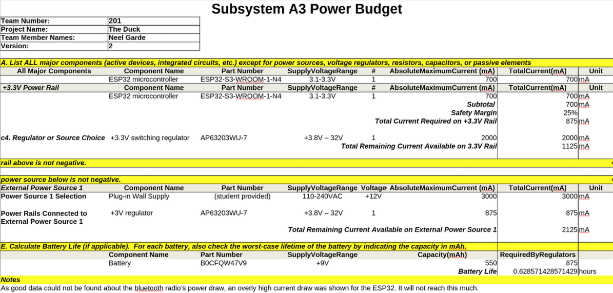 The power budget for subsystem A3 is calculated in the following chart: